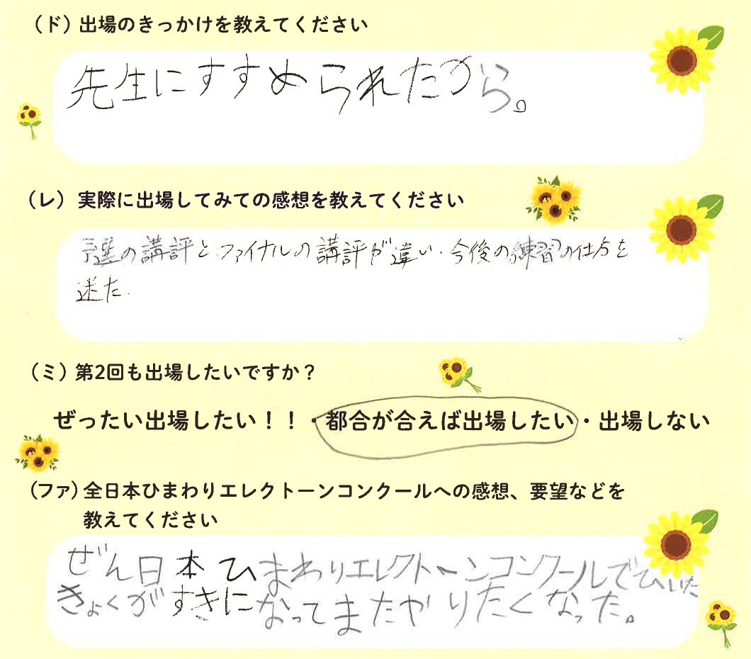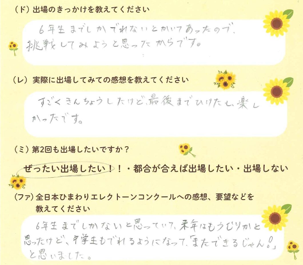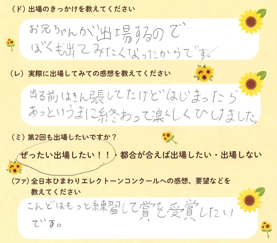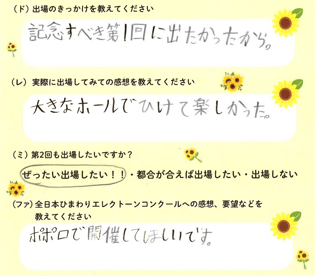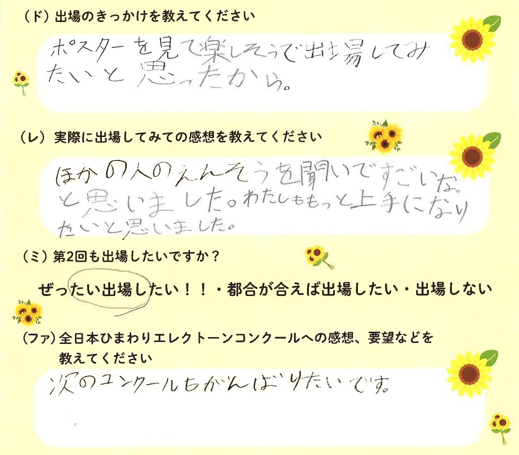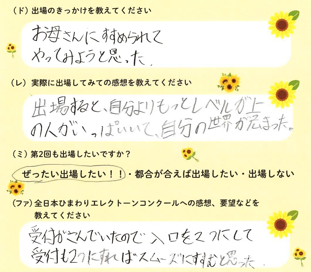 第1回の出場者にアンケートをご記入いただきました。ご協力頂きました皆様、ありがとうございました。 ~幼児の部より~ ~1学年の部より~ ~2学年の部より~ ~3学年の部より~ ~4学年の部より~ ~5学年の部より~ ~6学年の部より~