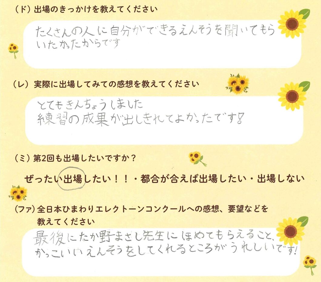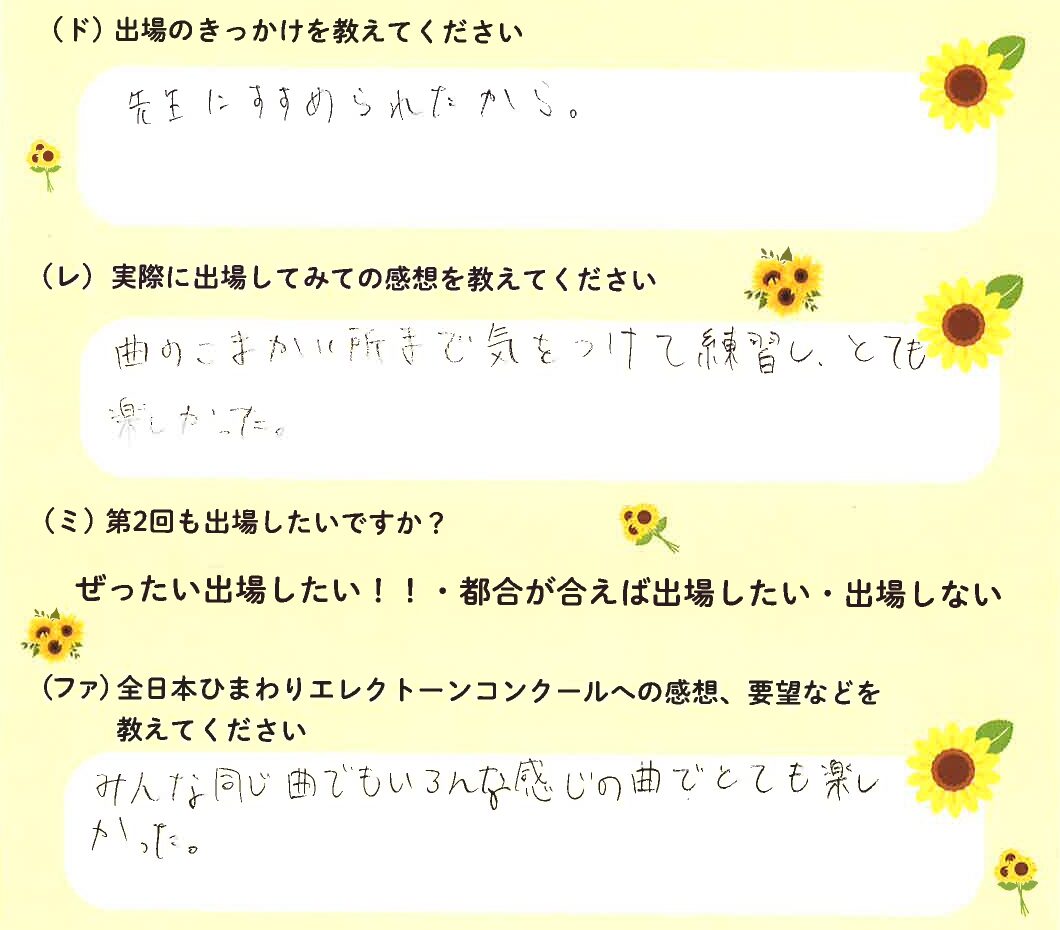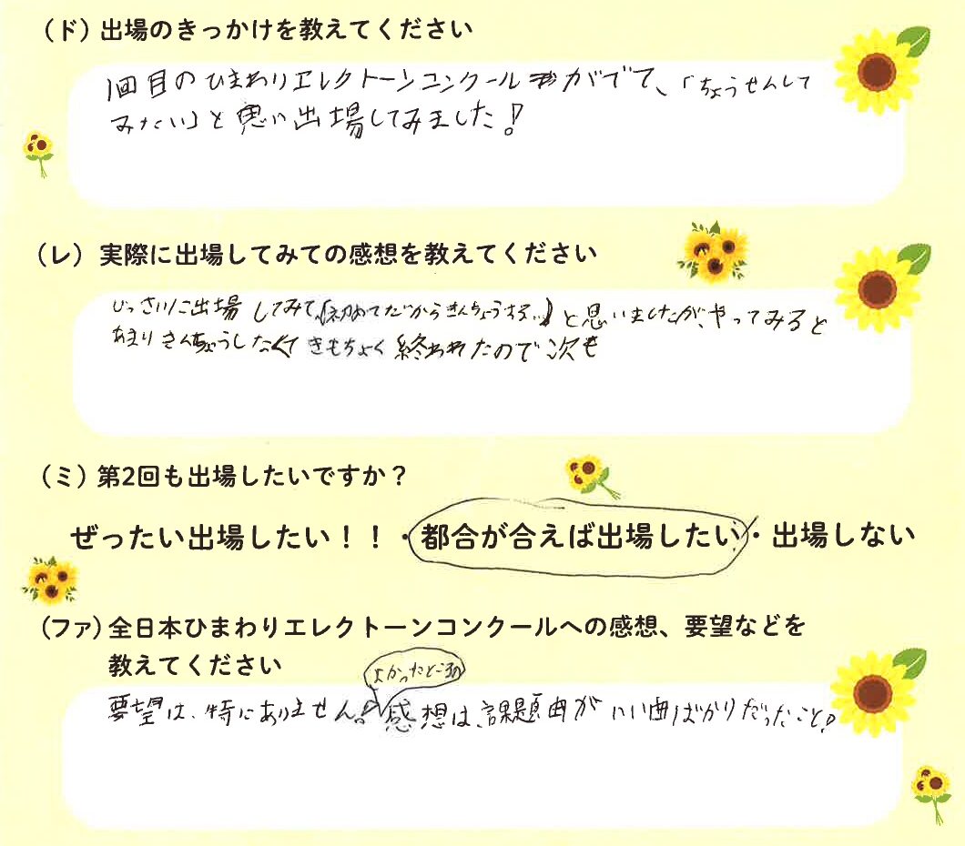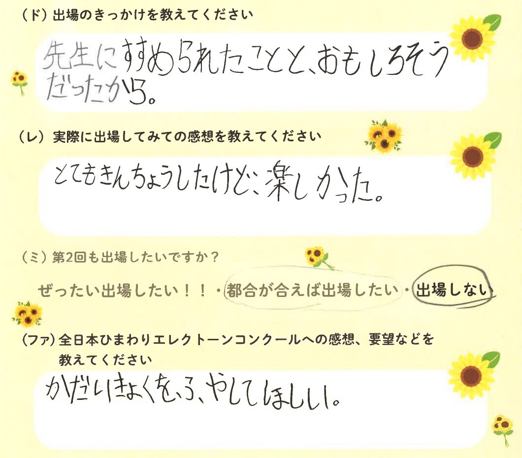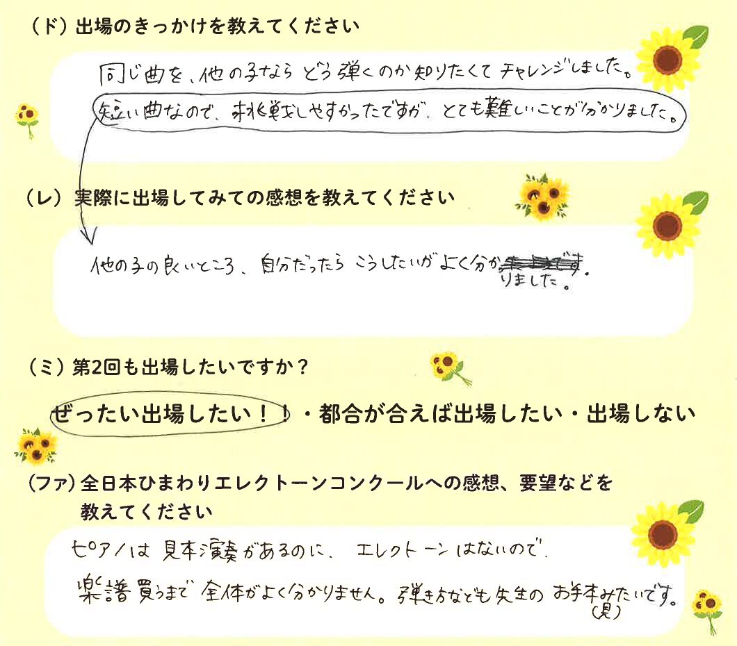 第1回の出場者にアンケートをご記入いただきました。ご協力頂きました皆様、ありがとうございました。 ~幼児の部より~ ~1学年の部より~ ~2学年の部より~ ~3学年の部より~ ~4学年の部より~ ~5学年の部より~ ~6学年の部より~