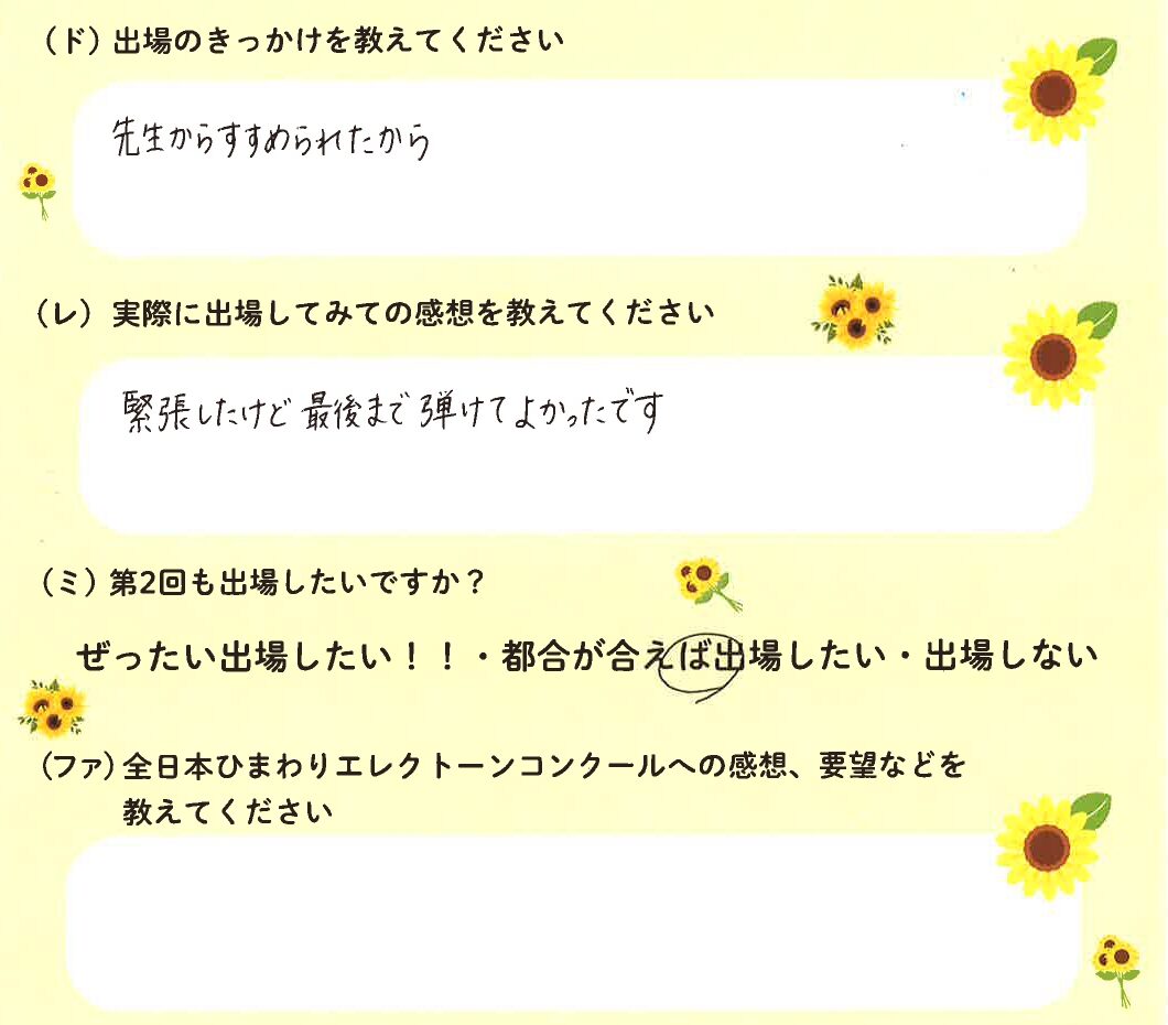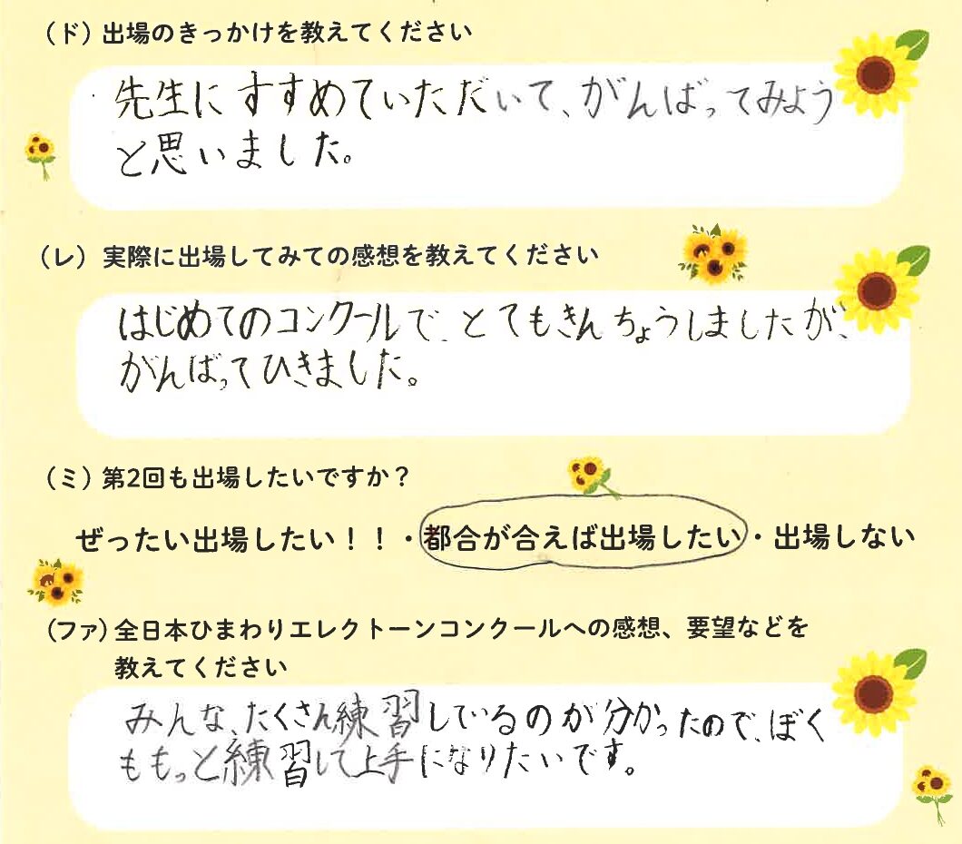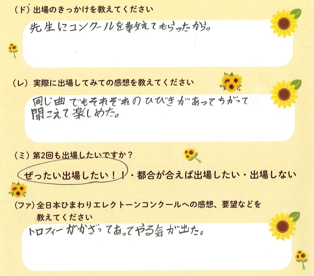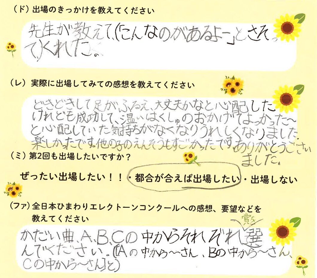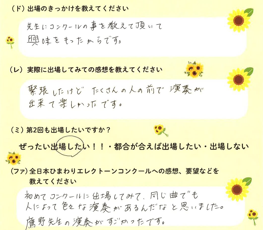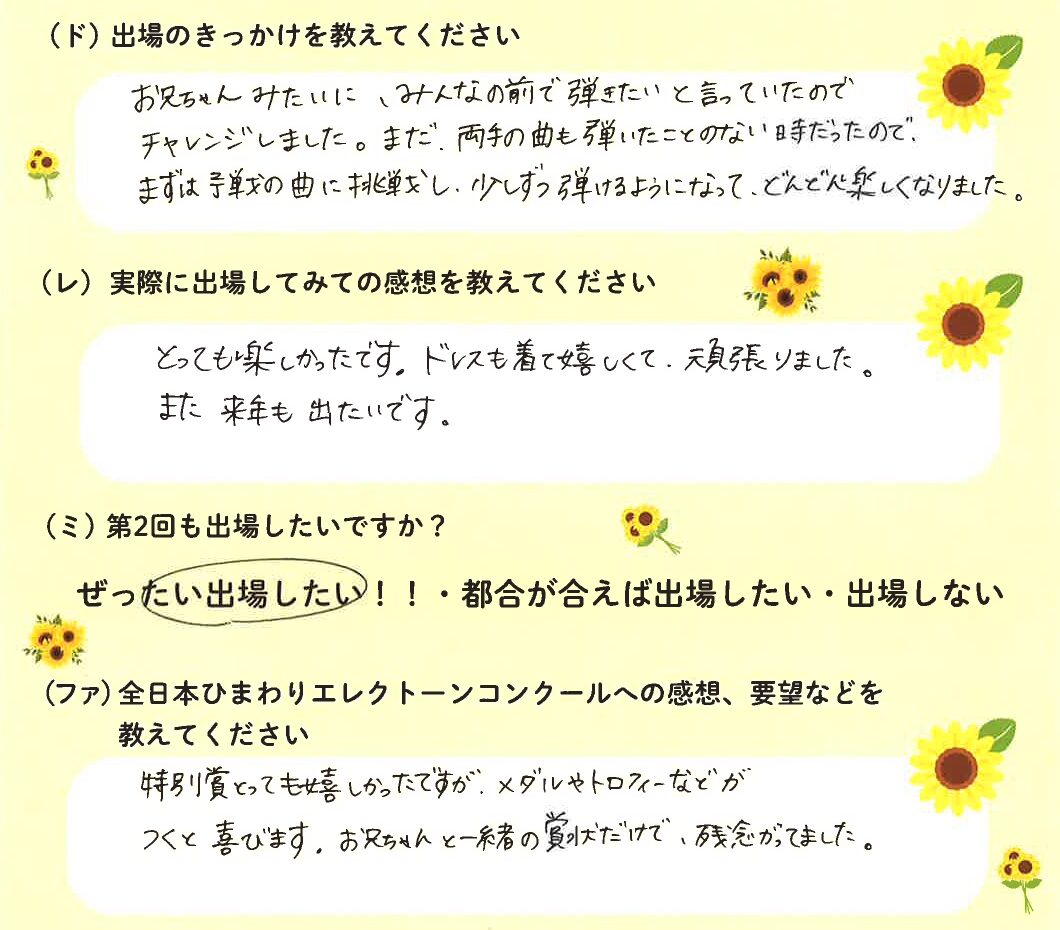 第1回の出場者にアンケートをご記入いただきました。ご協力頂きました皆様、ありがとうございました。 ~幼児の部より~ ~1学年の部より~ ~2学年の部より~ ~3学年の部より~ ~4学年の部より~ ~5学年の部より~ ~6学年の部より~