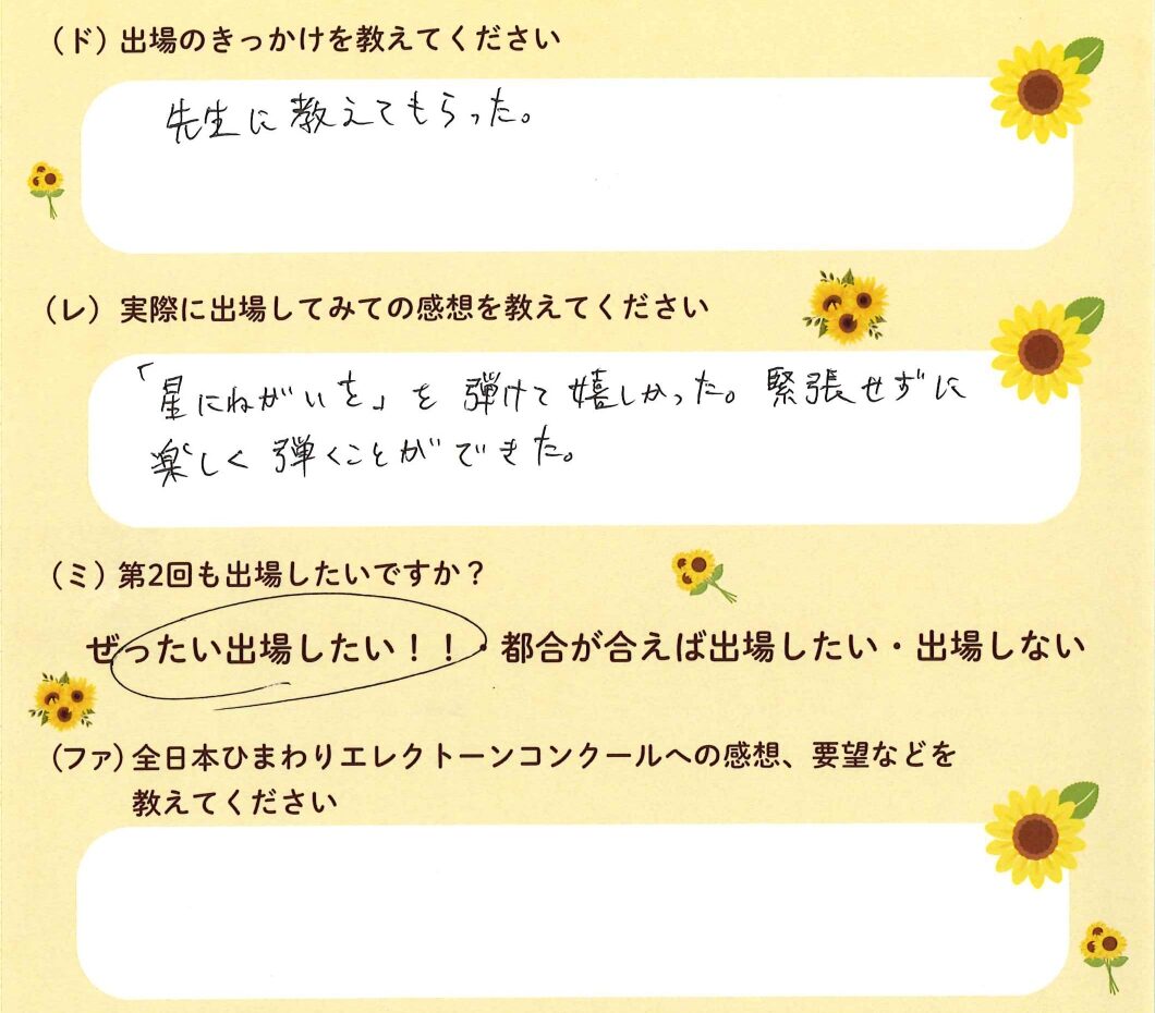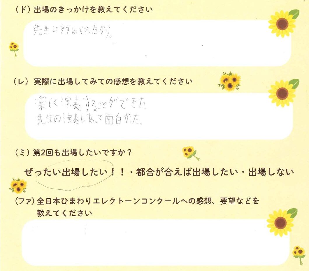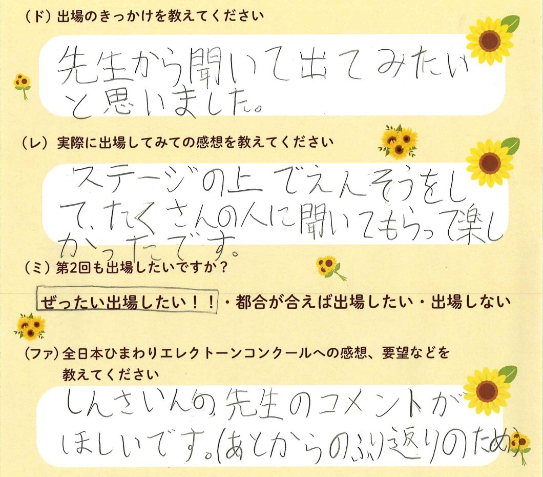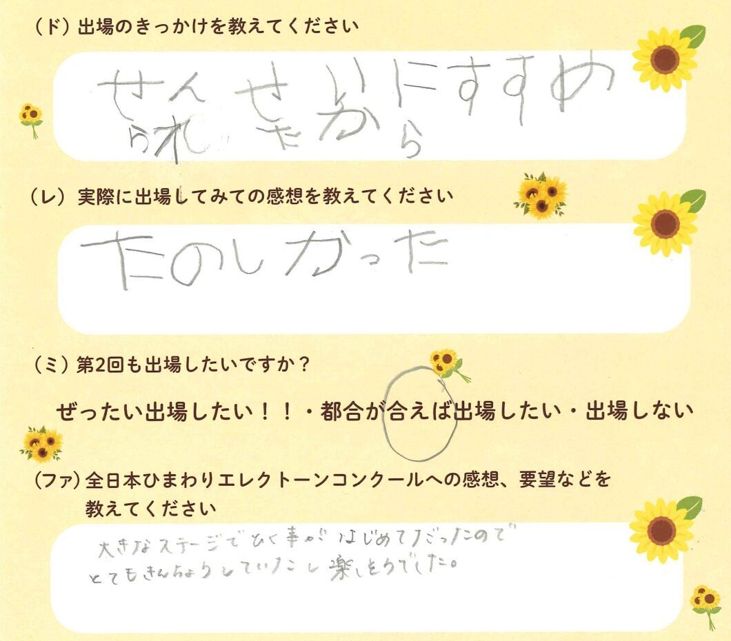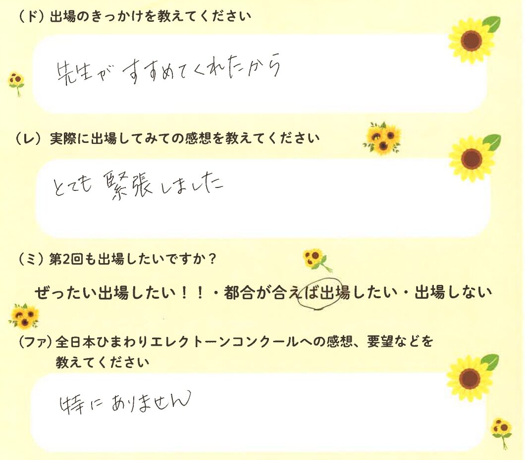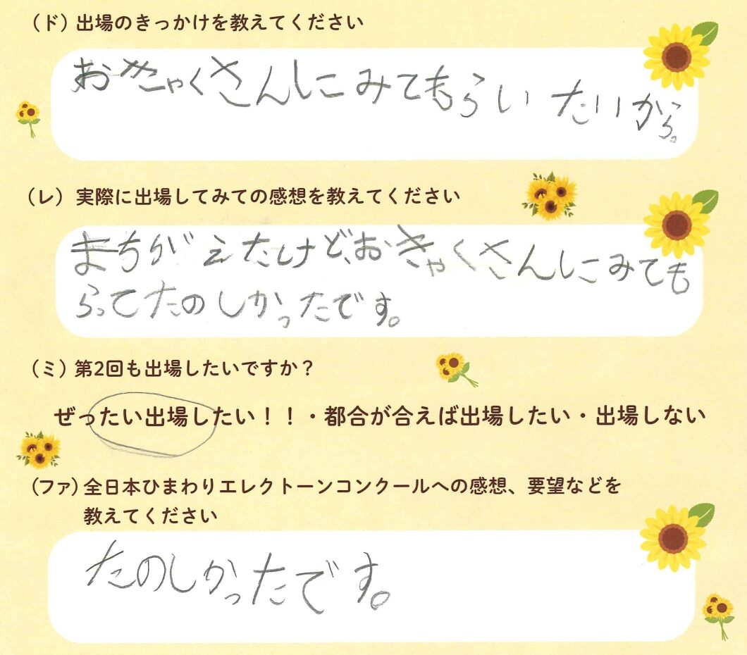 第1回の出場者にアンケートをご記入いただきました。ご協力頂きました皆様、ありがとうございました。 ~幼児の部より~ ~1学年の部より~ ~2学年の部より~ ~3学年の部より~ ~4学年の部より~ ~5学年の部より~ ~6学年の部より~