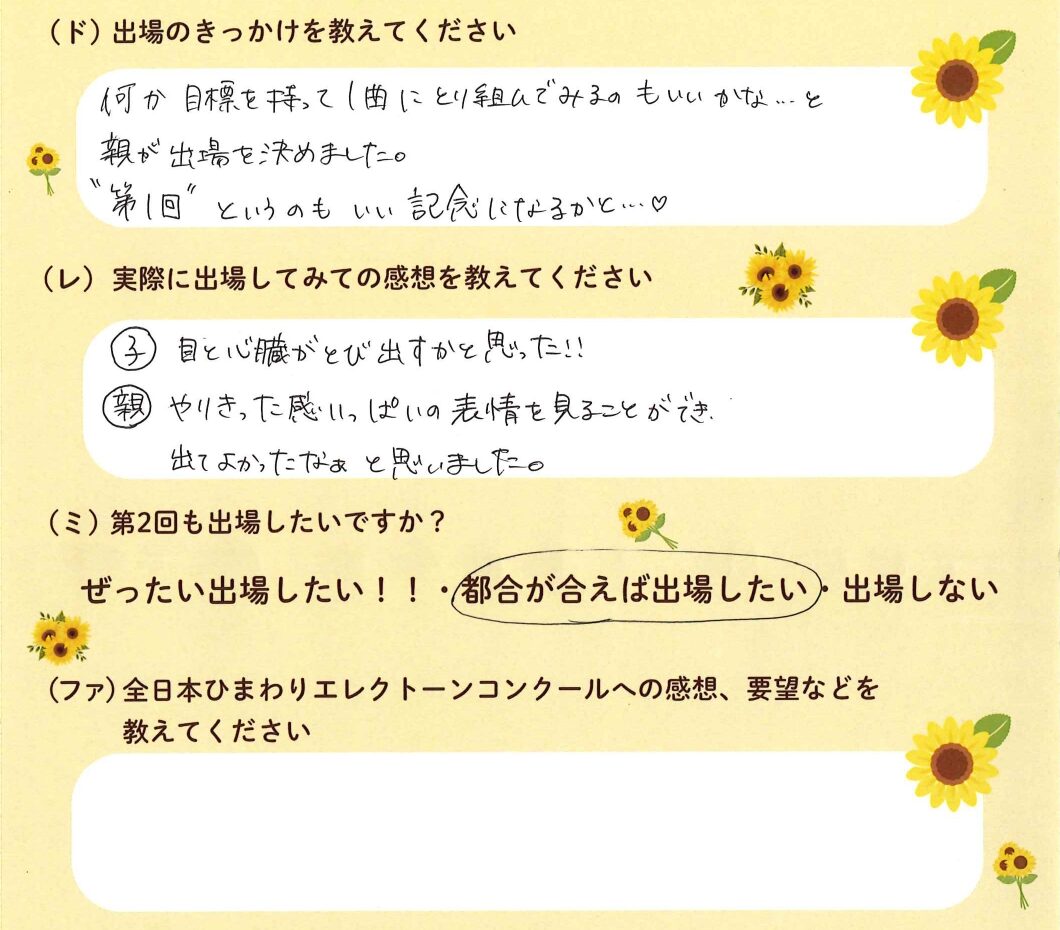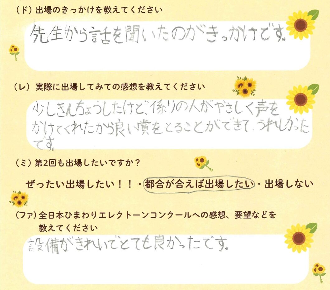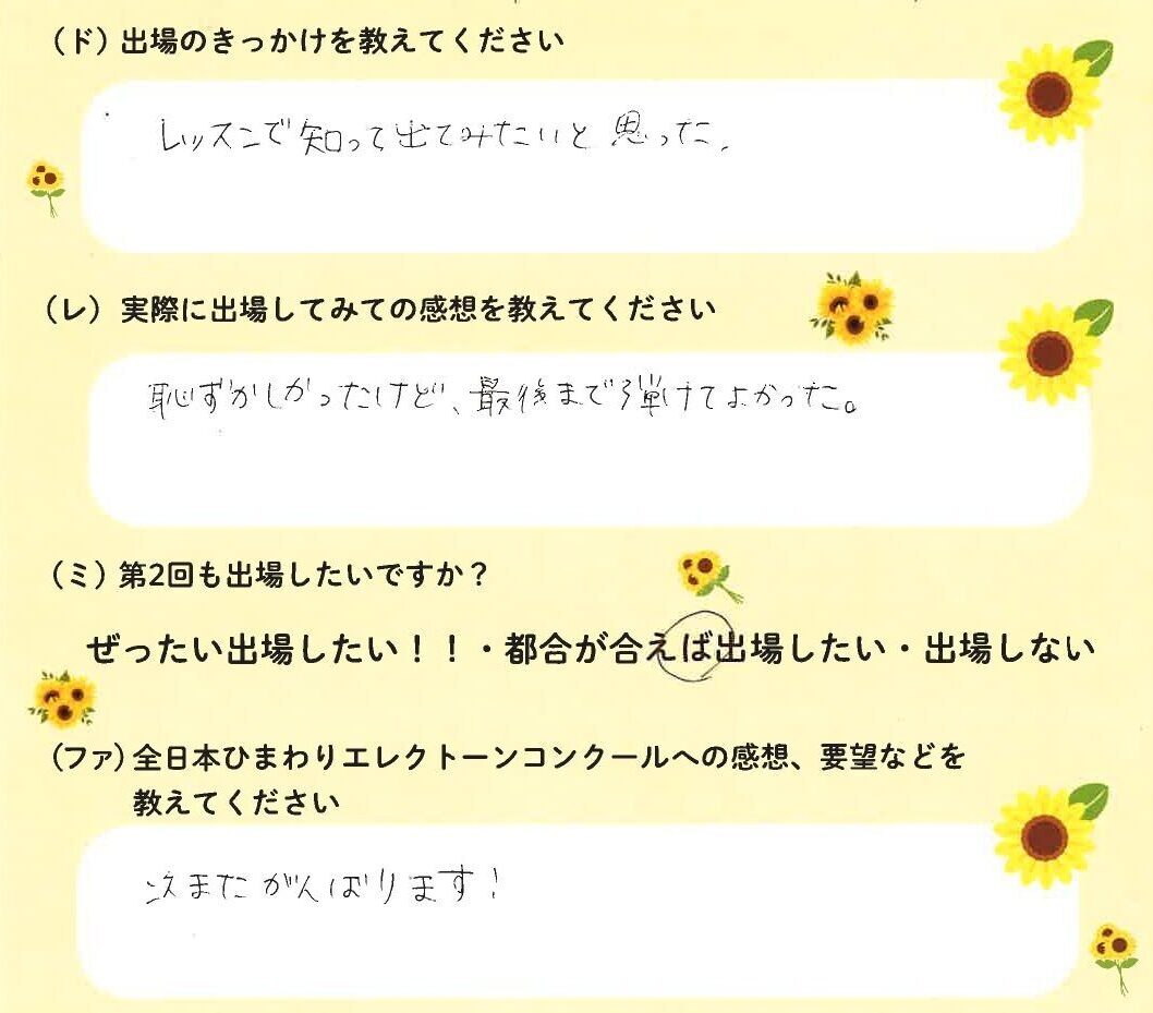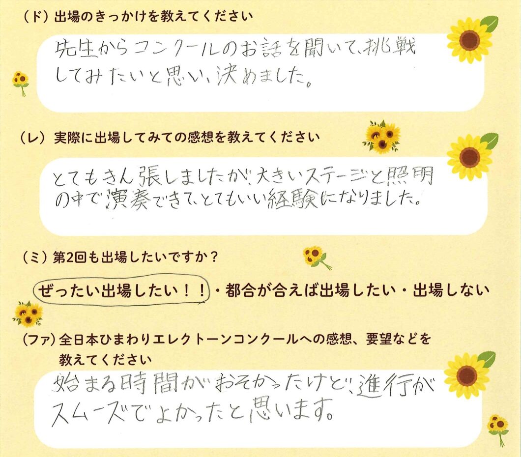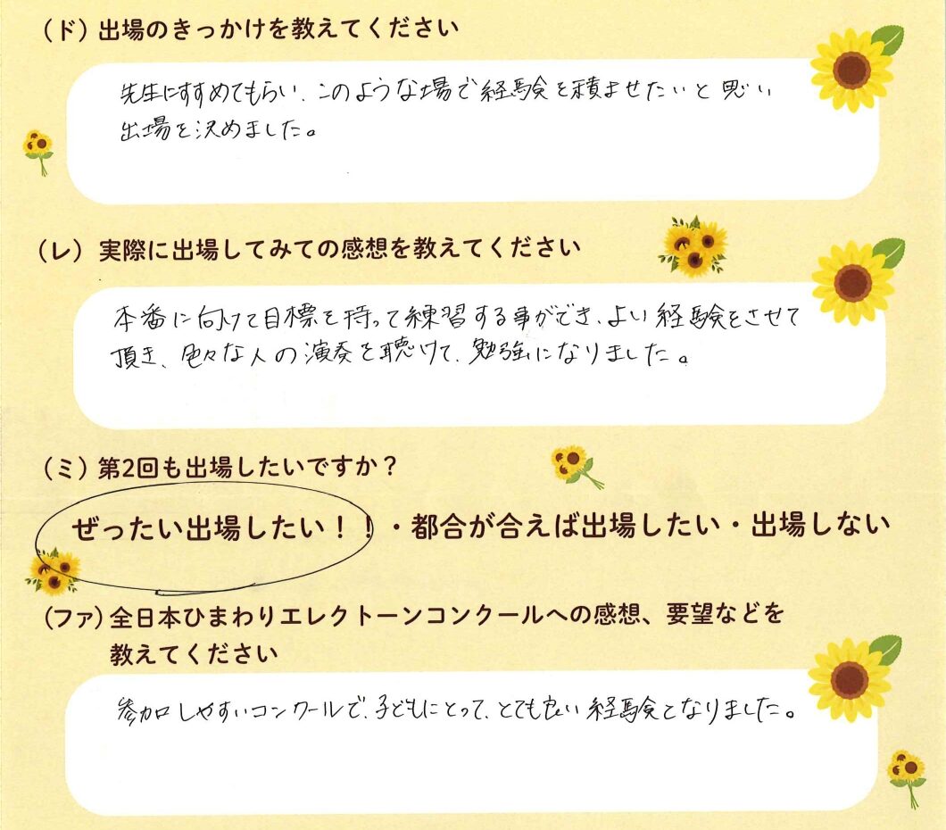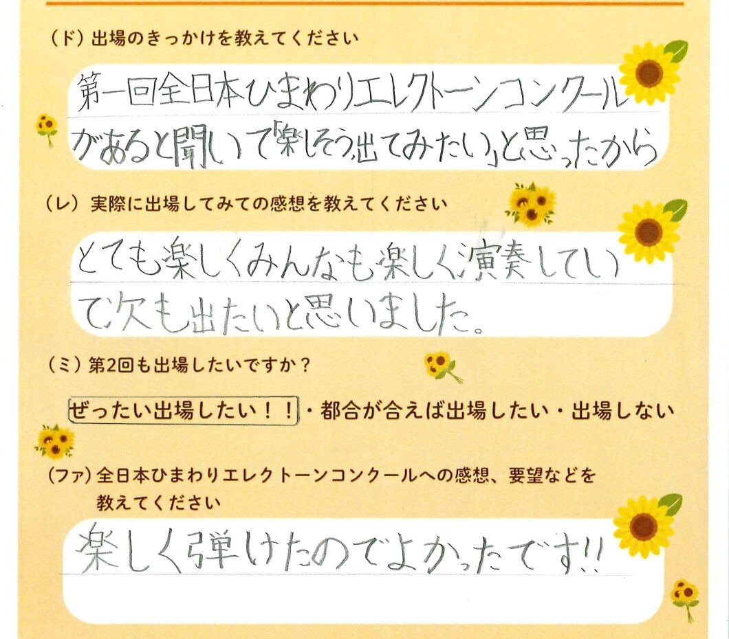 第1回の出場者にアンケートをご記入いただきました。ご協力頂きました皆様、ありがとうございました。 ~幼児の部より~ ~1学年の部より~ ~2学年の部より~ ~3学年の部より~ ~4学年の部より~ ~5学年の部より~ ~6学年の部より~