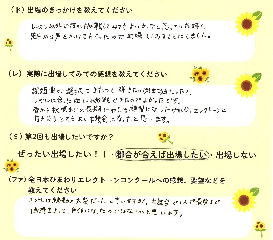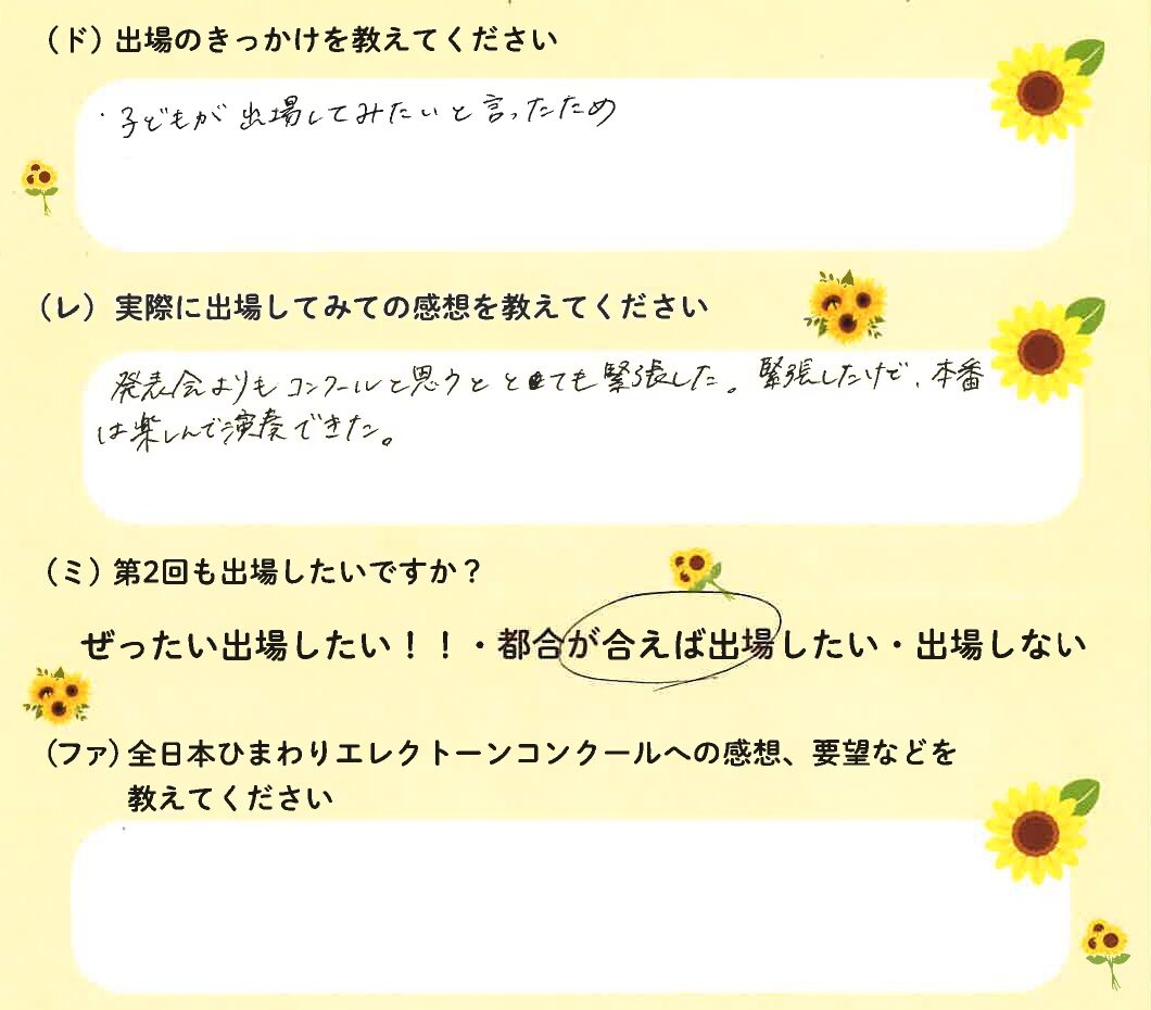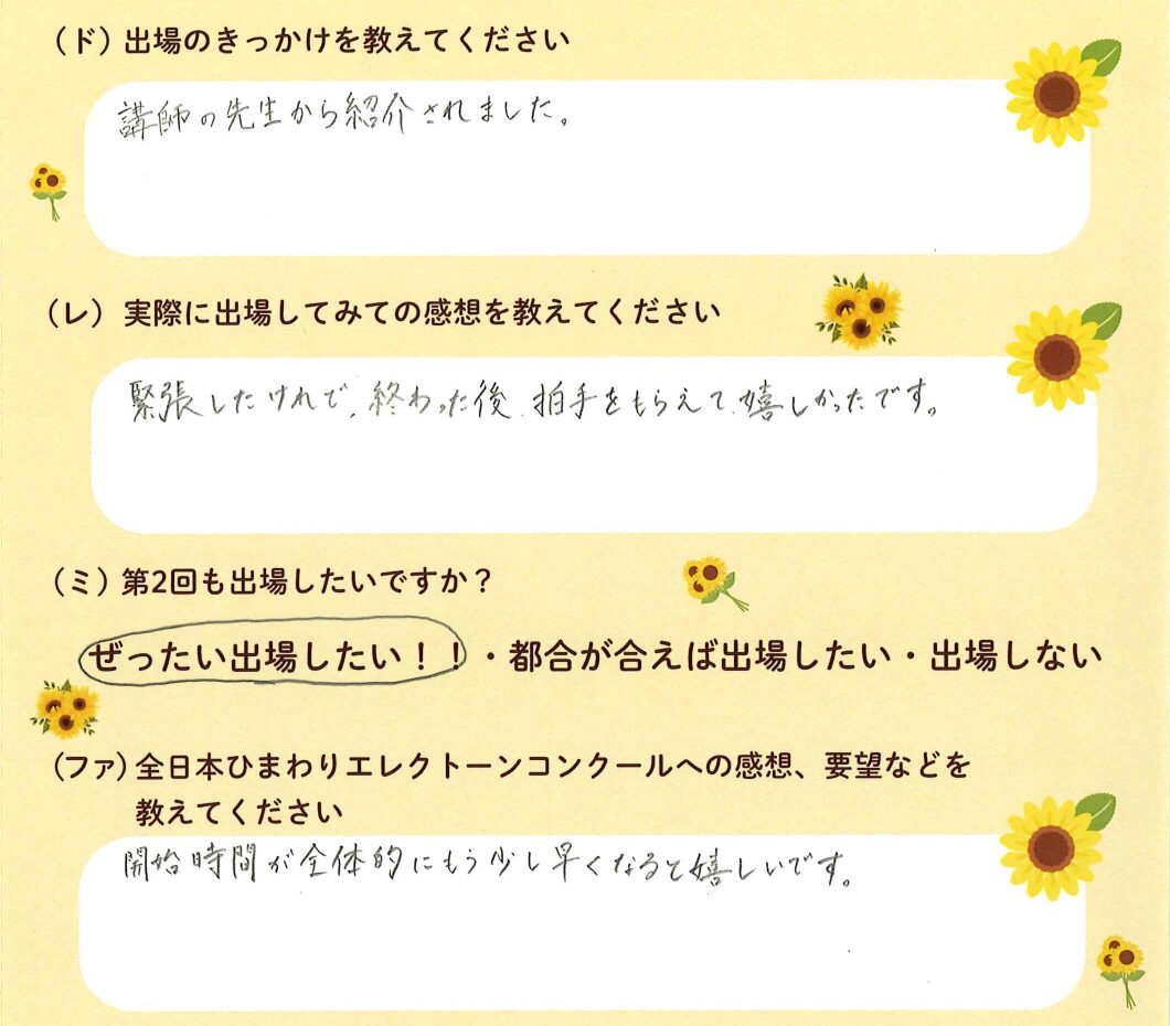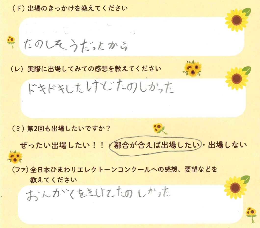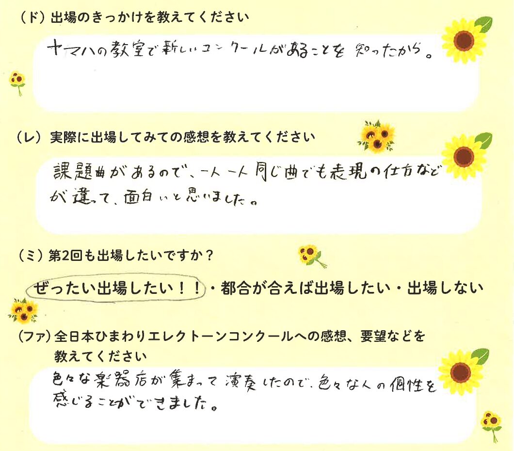 第1回の出場者にアンケートをご記入いただきました。ご協力頂きました皆様、ありがとうございました。 ~幼児の部より~ ~1学年の部より~ ~2学年の部より~ ~3学年の部より~ ~4学年の部より~ ~5学年の部より~ ~6学年の部より~