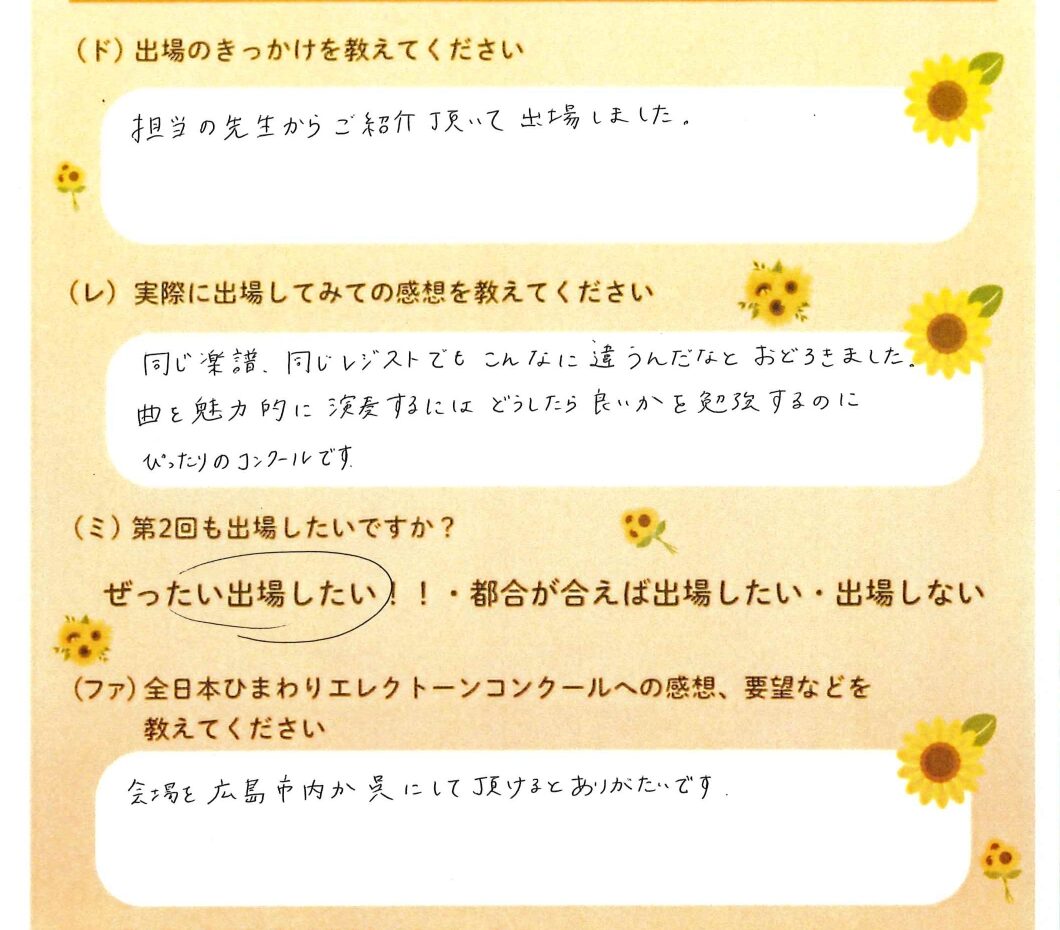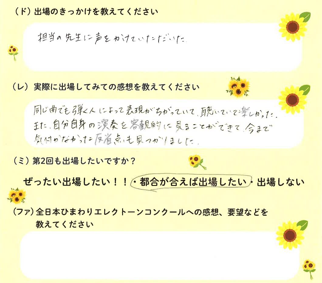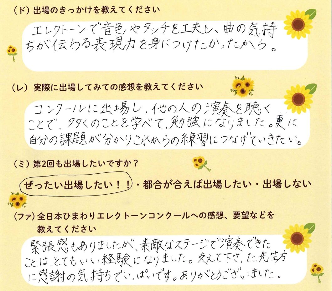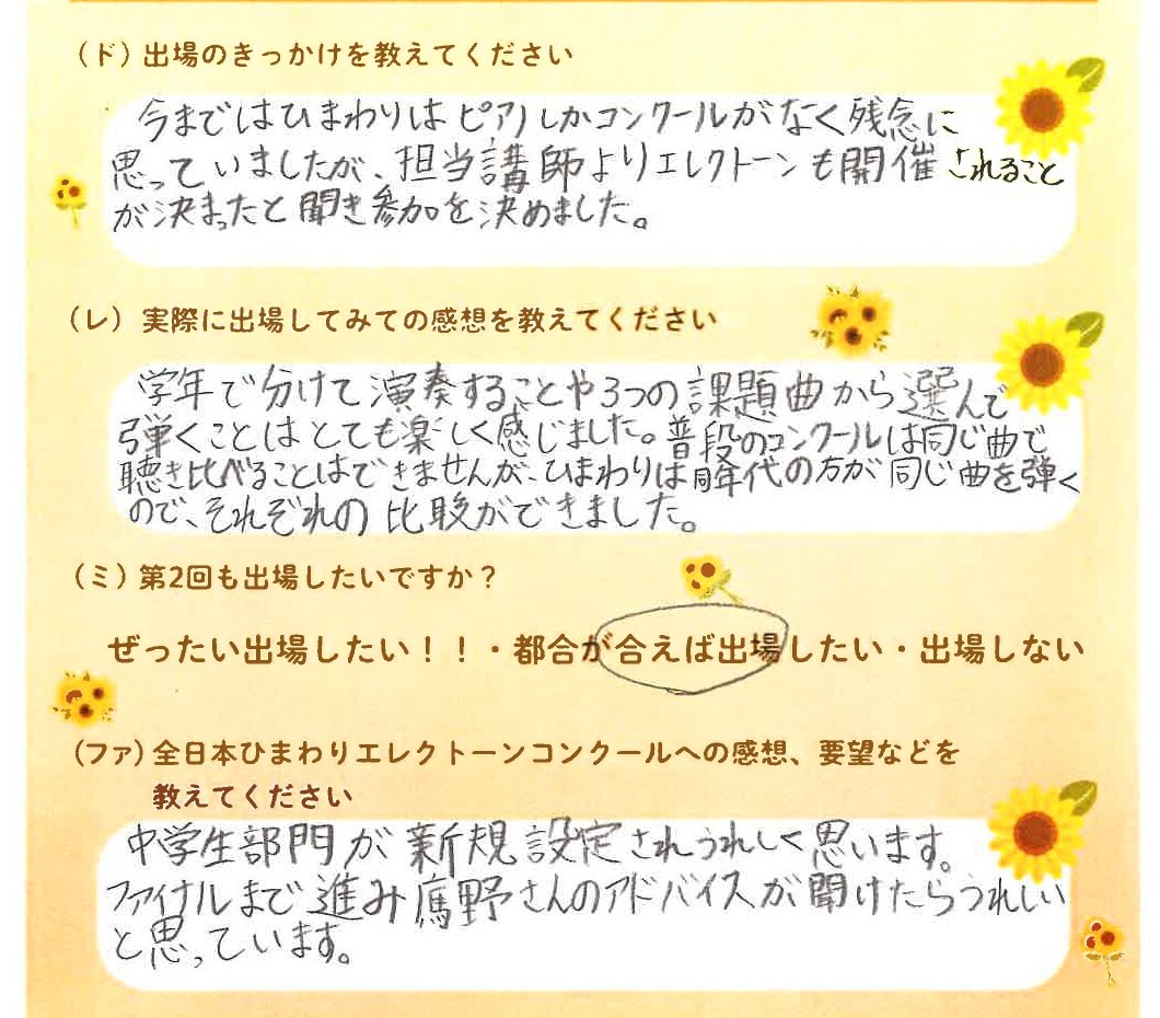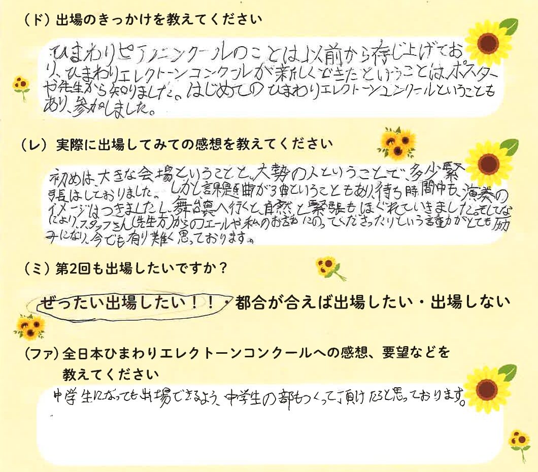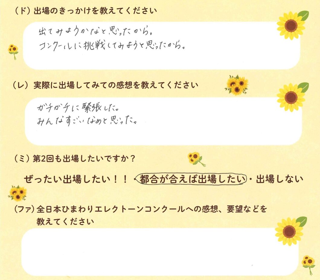 第1回の出場者にアンケートをご記入いただきました。ご協力頂きました皆様、ありがとうございました。 ~幼児の部より~ ~1学年の部より~ ~2学年の部より~ ~3学年の部より~ ~4学年の部より~ ~5学年の部より~ ~6学年の部より~